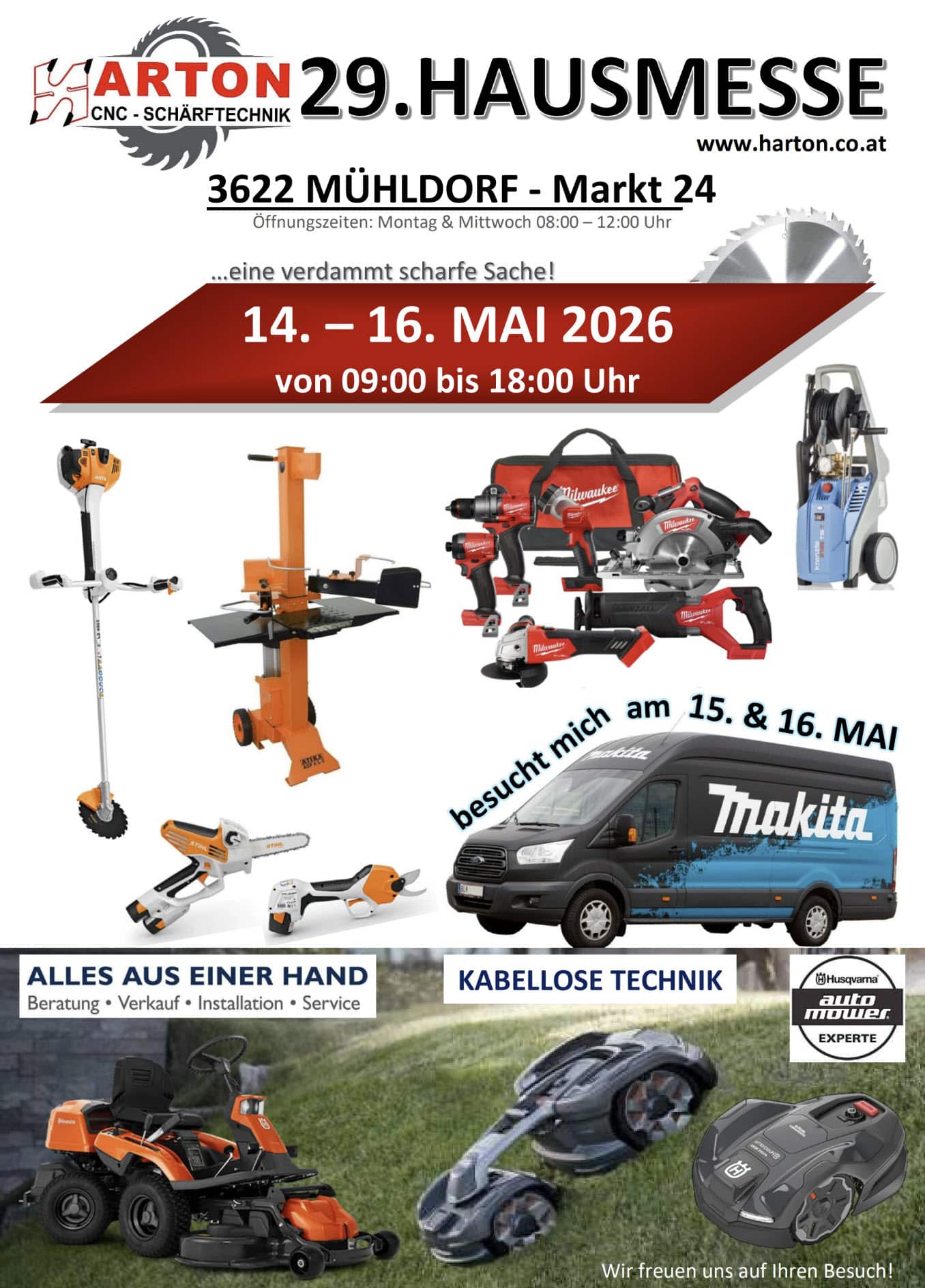 Heute bieten wir nicht nur einen der modernsten Schärfdienste mit zahlreichen CNC-Maschinen, sondern auch einen kompetenten Fachhandel für Holzbearbeitungsmaschinen, Elektrowerkzeuge und Forst- und Gartengeräte mit hauseigener Servicewerkstatt.